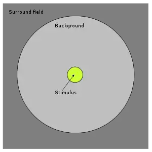 The inner circle is the stimulus, from which the tristimulus values should be measured in CIE XYZ using the 2° standard observer. The intermediate circle is the proximal field, extending out another 2°. The outer circle is the background, reaching out to 10°, from which the relative luminance (Yb) need be measured. If the proximal field is the same color as the background, the background is considered to be adjacent to the stimulus. Beyond the circles which comprise the display field (display area, viewing area) is the surround field (or peripheral area), which can be considered to be the entire room. The totality of the proximal field, background, and surround is called the adapting field (the field of view that supports adaptation—extends to the limit of vision).[3]