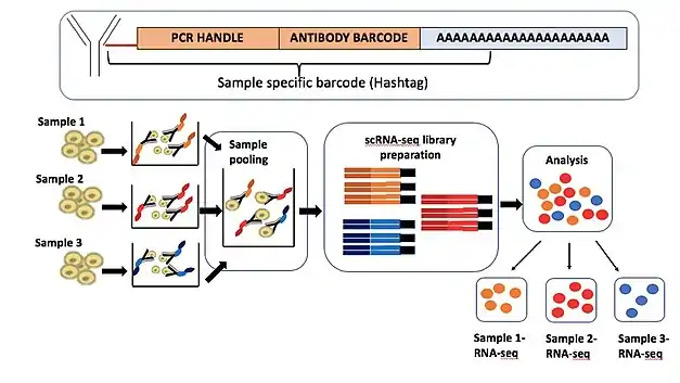 Cell Hashing: New York Genome Center further adapted the use of their antibody-oligonucleotide conjugates to enable sample multiplexing for scRNA-seq. This technique called, Cell Hashing,[12] uses oligonucleotide-labelled antibodies against ubiquitously expressed cell surface proteins from a particular tissue sample. In this case, an oligonucleotide sequence contains a unique barcode which would be specific to cells from distinct samples. This sample-specific cell tagging allows pooling of the sequencing libraries prepared from different samples on a sequencing platform. Sequencing the antibody tags along with the cellular transcriptome helps identify a sample of origin for each analyzed cell. A unique barcode sequence used on the cell hashing antibody can be designed to be different from an antibody barcode present on the ADTs used in CITE-seq. This makes it possible to couple cell hashing with CITE-seq on a single sequencing run.[12] Cell hashing allows super-loading of the scRNA-seq platform, resulting in a lower cost of sequencing. It also enables detection of artifactual signals from multiplets, a major challenge in scRNA-seq. The cell hashing method has further been used by Gaublomme et al. to multiplex single-nucleus RNA-seq (snRNA-seq) by performing nucleus hashing.[13]