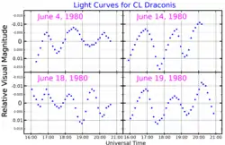 Based upon a stellar classification of F0 IV,[4] this is an aging F-type subgiant star that has consumed the hydrogen at its core. It is spinning rapidly with a projected rotational velocity of 165 km/s,[7] giving it an oblate shape with an equatorial bulge that is estimated to be 8% larger than the polar radius.[13] CL Dra is a Delta Scuti variable, changing brightness with an amplitude of 0.010 magnitude over a period of 1.83 hours.[14] CL Dra has 1.68[7] times the mass of the Sun and is radiating 10.2[7] times the Sun's luminosity from its photosphere at an effective temperature of 7,439 K.[8]