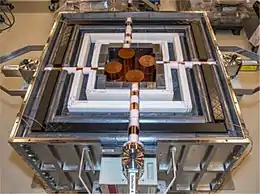 - Cosmic Radiation: Cosmic muons and muon-induced showers can interact with the target material of the detector in large quantities. Thus, cosmic radiation is one of the most relevant backgrounds. To suppress this type of background, many low background experiments are located deep underground. This is however not possible for CONUS; here the reactor building offers a modest overburden leading to a reduction of the muon flux by a factor of 2-3 only. To achieve an even better suppression of the muonic background, the CONUS detector is surrounded by an active muon veto system (see Figure 5). It consists of scintillator layers that can detect incoming muons crossing the detector setup. This way, the muon-induced background can be reduced approximately by a factor of 100.[4]