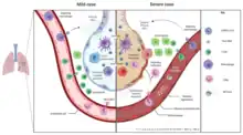 The effect of the virus on ACE2 cell surfaces leads to leukocytic infiltration, increased blood vessel permeability, alveolar wall permeability, as well as decreased secretion of lung surfactants. These effects cause the majority of the respiratory symptoms. However, the aggravation of local inflammation causes a cytokine storm eventually leading to a systemic inflammatory response syndrome.[149]
