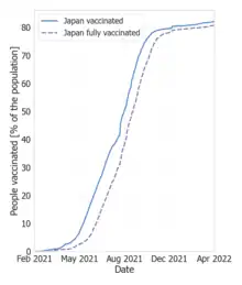 The COVID-19 vaccination in Japan began on 17 February 2021, more than a month after the first anniversary of the beginning of the pandemic in the country was commemorated. As of 22 October 2021, about 96.4 million people in Japan received at least one dose of the COVID-19 vaccine while about 86.9 million were fully vaccinated.
