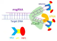 In order to assemble different transcriptional activators, the dCas9-SAM system uses a modified single guide RNA (sgRNA) that has binding sites for the MS2 protein. Hairpin aptamers are attached to the tetra loop and the stem loop 2 of the sgRNA to become binding sites for dimerized MS2 bacteriophage coat proteins. As the hairpins are exposed outside of the dCas9-sgRNA complex, other transcriptional factors can bind to the MS2 protein without disrupting the dCas9-sgRNA complex. Thus, the MS2 protein is engineered to include p65 and HSF1 proteins. The MS2-p65-HSF1 fusion protein interacts with the dCas9-VP64 to recruit more transcriptional factors onto the promoter of the target genes.