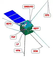 The CSES payload includes: two particle detectors (the High-Energy Particle Detectors (HEPD) and the High-Energy Particle Package (HEPP)) to measure flux, energy spectrum, type and direction of impinging particles; a Search-Coil Magnetometer (SCM) and a High Precision Magnetometer (HPM) to measure the components and the total intensity of the magnetic field, respectively; a four probes Electric Field Detector (EFD) to measure the electric field components in a wide frequencies range; a Plasma analyzer Package (PAP) and a Langmuir probe (LP) to measure plasma parameters; a GNSS Occultation Receiver and a Tri-Band Beacon to measure the density of electrons and to perform ionospheric tomography.[10]