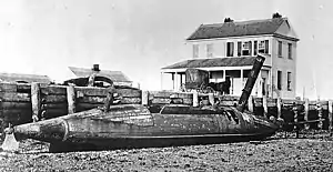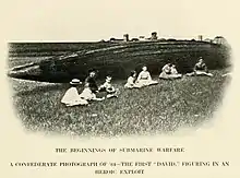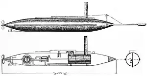 Based upon a design by St. Julien Ravenel, David was built as a private venture by T. Stoney at Charleston, South Carolina, in 1863, and was put under the control of the Confederate States Navy (CSN).[1] The cigar-shaped boat carried a 32-by-10-inch (810 by 250 mm) explosive charge of 134 pounds (61 kg) gunpowder on the end of a spar projecting forward from her bow.[1] CSS David operated as a semi-submersible: water was taken into ballast tanks so that only the length of the open-top conning tower and the stack for the boiler appeared above water.[2] Designed to operate very low in the water, David resembled in general a submersible submarine; she was, however, strictly a surface vessel.[1] Operating on dark nights, and using anthracite coal (which burns without smoke), David was nearly as hard to see as a true submarine.