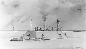Palmetto State was initially armed with one 7-inch (178 mm) Brooke rifle on a pivot mount at the bow, a 6.4-inch (163 mm) Brooke rifle on a pivot mount in the stern, with two 8-inch (20.3 cm) muzzle-loading smoothbore guns on the broadside.[5] The ship was later equipped with a spar torpedo on her bow in 1863.[7] The Dictionary of American Naval Fighting Ships merely states that her armament consisted of two rifled guns and two smoothbore 9-inch (229 mm) guns.[3] Naval historian Raimondo Luraghi states that the ship was armed with two Brooke rifles and two smoothbores,[8] Naval historian Donald Canney says that a January 1865 report shows the ship equipped with ten 7-inch Brooke rifles, four on each broadside and one each in the bow and stern. He does not believe that it is accurate because the addition of so many additional guns would require rebuilding the casemate and would strain the ship's hull with so much extra weight.[5]