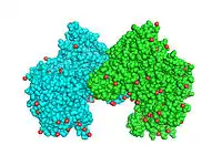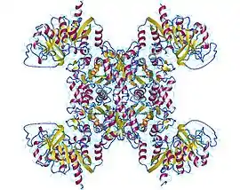Active CTP synthase exists as a homotetrameric enzyme. At low enzyme concentrations and in the absence of ATP and UTP, CTP synthase exists as inactive monomer. As enzyme concentration increases, it polymerizes first to a dimer (such as the form shown to the left) and, in the presence of ATP and UTP, forms a tetramer.[5][9]