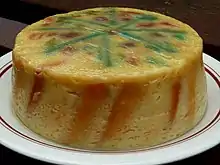 Cabinet pudding, also known as chancellor's pudding or Newcastle pudding,[1] is a traditional English steamed, sweet, moulded pudding made from some combination of bread or sponge cake or similar ingredients in custard, cooked in a mould faced with decorative fruit pieces such as cherries or raisins, served with some form of sweet sauce.[2][3] Other versions of cabinet pudding might use gelatin and whipped cream.[4]