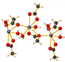 Unlike the coordination geometry of zinc in zinc diacetate dihydrate, cadmium is seven coordinate in Cd(O2CCH3)2(H2O)2.[7] It is a coordination polymer, featuring acetate ligands interconnecting cadmium centers.