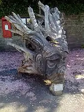 Caerleon also has associations with later Arthurian literature as the birthplace of the writer Arthur Machen who often used it as a location in his work. Alfred Tennyson lodged at The Hanbury Arms while he wrote his Morte d'Arthur (later incorporated into his Idylls of the King).[33] Today Caerleon has a modern statue of a knight, "The Hanbury Knight", in reflecting stainless steel by Belgian sculptor Thierry Lauwers.[34] In Michael Morpurgo's novel Arthur, High King of Britain, Caerleon is the castle where Arthur unknowingly commits incest with his half-sister Morgaine, resulting in the conception of his son Mordred who will later bring about his downfall. Mary Stewart's account of the Arthurian legends also mentions Caerleon as a place where Arthur held court. In that telling, the incest took place at Luguvalium.[35]