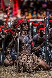 Cakalele dance (pronounced "cha-ka-leh-leh", spelled tjakalele by the Dutch) is a war dance from North and Central Maluku in Indonesia.[1] Hybrid versions also exist among the natives of Sulawesi, Timor, and the Tanimbar Islands. The dance is performed by men, two of whom represent opposing captains or leaders while the others are the warriors supporting them. After an opening ritual, the captains engage in a mock-duel with a spear (sanokat) and long knife (lopu) while their supporters use a long knife in the right hand and a narrow wooden shield in the left hand.[2] The shield is referred to as a salawaku, or by a local name such as the Tobelo o dadatoko.[3] The cakalele originated as a way for the warriors to celebrate after a successful raid. Dancers dress in full warrior costume and are backed by the rhythm of the drum and gong (tifa) and fife (sulin).