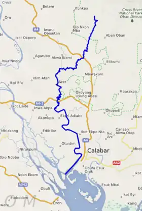 The Calabar River in Cross River State, Nigeria flows from the north past the city of Calabar, joining the larger Cross River about 8 kilometres (5.0 mi) to the south. The river at Calabar forms a natural harbor deep enough for vessels with a draft of 6 metres (20 ft).[1]