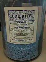 When sold at the anhydrous state as a desiccant with a color-indicating agent under the name Drierite, it appears blue (anhydrous) or pink (hydrated) due to impregnation with cobalt(II) chloride, which functions as a moisture indicator.