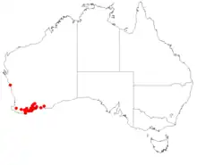 This species of blue tinsel lily occurs from Albany and Stirling Range National Park east to Hopetoun. It is scattered in the Stirling Range, Fitzgerald River and Frank Hann national parks, growing on quartzite sands, in mallee woodland or heath often over laterite or granite.[1]