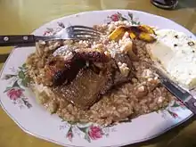 Calentao', sometimes spelled calenta'o (Colombian Spanish creole folk slang for "heated," derived from the Standard Spanish word calentado) is a Paisa and Antioquia, Colombian cuisine dish made from reheated leftovers including rice, egg, pasta, beans, potatoes and other foods such as arepa, chorizo, and ground beef. It is generally eaten for breakfast and is often accompanied by aguapanela, arepa, coffee, juice or hot chocolate. Depending on the region it can also be served with hogao.[1] It is sometimes referred to as Fríjoles Trasnochaos. A fried egg is usually served on top of the dish and it is called Calentao' "A Caballo" . It is usually eaten for breakfast using some of the night before's leftovers.[2]