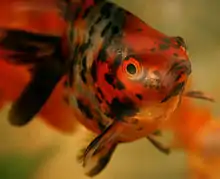 Calico goldfish are goldfish of any breed that have a type of scale that is intermediate between the metallic type of scales and the transparent type.[1] These scales have a slight sheen that produces a pearly appearance.[2][3] The name "calico goldfish" came about because the first fish that were introduced with this type of scales had a mottled calico pattern with several colours.[1]
