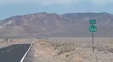 SR 266 is not part of the National Highway System,[3] a network of highways that are considered essential to the country's economy, defense, and mobility by the Federal Highway Administration.[4] The section of SR 266 from the western terminus to the junction with SR 168 is designated by the California State Legislature as eligible by law for the State Scenic Highway System;[5] but it is not officially designated as a scenic highway by Caltrans.[6] The entire route, consisting of two lanes for two-way traffic, traverses on the flat land in the Fish Lake Valley east of the White Mountains, and it can serve as transportation of agricultural goods between California and Nevada via the route's only junction (SR 168). In the event that SR 168 is closed, SR 266 connects to SR 264, which intersects with U.S. Route 6 (US 6) in order to provide an alternate access to California.[2]