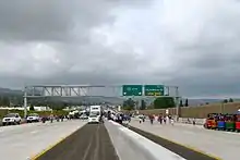 "Heavy construction" of SR 52 from SR 125 eastward to SR 67 began in February 2008. More than 360 properties were acquired to build the freeway; at least 60 were mobile homes.[106] This portion was divided into three construction projects: from SR 125 to Cuyamaca Street, from there to Magnolia Avenue, and the interchange with SR 67, which began construction in mid-June 2008. The middle project had to be shut down briefly in February 2009 due to funding issues.[109][110] Completion was scheduled for 2010, but was postponed to early 2011 due to weather-related delays.[111] This new portion was opened to traffic on March 29, 2011. The cost of this project was $525 million, funded with state and federal funds as well as TransNet revenue. The opening was predicted to reduce traffic on I-8 as well as Mission Gorge Road and other Santee thoroughfares.[112] The official "ribbon cutting" ceremony took place on March 19, 2011 on the freeway at the Cuyamaca Street interchange.[113]