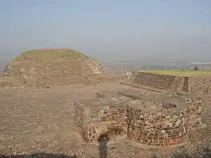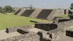 The Postclassic site extended approximately 264 hectares, covering portions of the valley floor, the majority of the Cerro Tenismo hill, and portions of a smaller hill to the east.[3] All of the major monumental architecture at the site was built during this period. Unlike many Postclassic Mesoamerican cities, which usually have a single central group of monumental architecture, the large structures at Calixtlahuaca are split into multiple smaller architectural groups scattered from the valley floor to the summit of the hill. The areas between the monumental groups were filled in with a mixture of commoner houses and agricultural terraces.[3]
