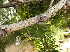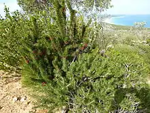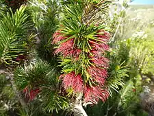 Calothamnus pinifolius is an erect shrub that grows to 0.3–2.0 m (1–7 ft) high with a few long shoots and branches and a short shoot emerging from above the leaves of every long one.[2] Its leaves are about 20–30 mm (0.8–1 in) long, crowded, thin and prickly.[3][4]