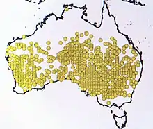 Grows in heavy clays to shallow stony soils, in a wide variety of communities; widespread, especially in inland districts. Known and current population ranges from NSW, Qld, Vic, NT, SA and WA. Found abundantly in Central Australia.[8] Recorded populations can be seen on the figure to the right (yellow dots on the map of Australia).