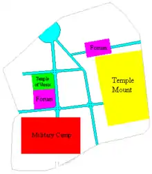 The Romans typically built a city according to a Hippodamian grid plan – a north–south arterial road, the Cardo (which is now the Suq Khan-ez-Zeit), and an east–west arterial road, the Decumanus Maximus (which is now the Via Dolorosa).[46] The forum would traditionally be located on the intersection of the two roads, with the main temples adjacent.[46] However, due to the obstruction posed by the Temple Mount, as well as the Tenth Legion encampment on the Western Hill, Hadrian's city had two Cardo, two Decumanus Maximus, two forums,[46] and several temples. The Western Forum (now the Muristan) is located on the crossroads of the West Cardo and what is now El-Bazar/David Street, with the Temple of Aphrodite adjacent, on the intersection of the Western Cardo and the Via Dolorosa. The Northern Forum is located north of the Temple Mount, on the junction of the Via Dolorosa and the Eastern Cardo (the Tyropoeon), adjacent to the Temple of Jupiter Capitolinus, intentionally built atop the Temple Mount.[47] Another popular holy site that Hadrian converted to a pagan temple was the Pool of Bethesda, possibly referenced to in the fifth chapter of the Gospel of John,[48][49] on which was built the Temple of Asclepius and Serapis. While the positioning of the Temple of Aphrodite may be, in light of the common Colonia layout, entirely unintentional, Hadrian is known to have concurrently built pagan temples on top of other holy sites in Jerusalem as part of an overall "Romanization" policy.[50][51][52][53][54]