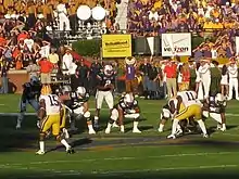 On October 23, Newton led Auburn to a 24–17 victory over the LSU Tigers. He rushed for a season-high 217 yards in the game, giving him 1,077 yards for the season, and set the SEC record for yards rushing in a season by a quarterback—a record previously held by Auburn quarterback Jimmy Sidle that had stood for over 40 years.[42] After this game, Newton became just the second quarterback to rush for over 1,000 yards in the conference's history.[43] He also broke Pat Sullivan's school record for most touchdowns in a single season, a record that had stood since 1971, with 27.[44] Both of these records were broken on the same play: a 49-yard touchdown run in which Newton escaped two tackles, corrected himself with his arm, eluded two additional tackles, and dragged a defender into the endzone for the touchdown. The play was described as Newton's "Heisman moment".[45][46][47] Auburn received its first No. 1 overall BCS ranking, and Newton was listed as the overall favorite for the Heisman.[48] In the following game against Ole Miss, Newton scored on a 20-yard receiving touchdown on a pass from Kodi Burns on a trick play.[49]