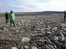 The first known people to occupy the area were the Pre-Dorset people, somewhere around 1800 BCE, about 4,000 years ago, and were seal and caribou hunters.[15] The next group to enter the area were a Paleo-Eskimo peoples known as the Dorset, who arrived approximately 500 CE. They were the first known people to have fished for the Arctic char.[16] The last of the Paleo-Eskimo people, who appeared here about 800 CE, were the Tuniit, and evidence of their living quarters can be seen close to Cambridge Bay. The Tuniit, who were known to the Inuit as giants, were taller and stronger than the Inuit, but were easily scared off.[17][18]