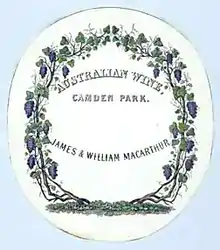 William encouraged winemaking and brought out several German vignerons and their families. From the 1830s onward, the estate played a major role in establishing the wine industry by exporting tens of thousands of vine cuttings to Western Australia, Tasmania and Victoria.[20] During the 1840s, vineyards were planted and the home farm expanded as new buildings were constructed and additions made to the cottage. The estate and family were instrumental in establishing the Australian wine industry. Camden Park became world-renowned for the quality of its wine. Camden Park played a vital role in the fledgling Australian wine industry through its importation and distribution of vine cuttings throughout NSW and the Barossa Valley of SA. By 1853 Camden Park listed some 33 grape varieties for sale. By 1841 William & James were producing more than 5000 gallons and that vintage won gold medals in England. In 1844 24,000 vine cuttings were sent from Camden Park to Adelaide, setting South Australia on a path to becoming an internationally acclaimed wine growing district.[10] Camden Park became world-renowned for the quality of its wine and by 1845 was producing around 45,000 litres; 12,000 US gallons (10,000 imp gal) per annum as a serious vineyard and one of the most highly regarded in the colony and with quite a reputation overseas.[1][11]