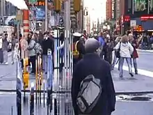 Examples of her work include Text Rain (1999),[1][2] created in collaboration with Romy Achituv, in which participants use their bodies to lift and play with falling letters projected on a wall, and Shifting Times (2007),[3] a public installation in San Jose, California that creates interactive projects based on the movements of pedestrians. Helen Lessick describes the latter as a "blending screens of twentieth and twenty-first century San José" in which the "images split and weave, shift between color and black and white, invoking loss and possibility, site and memory."[4]