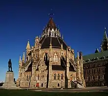 The Parliament Buildings are three edifices arranged around three sides of Parliament Hill's central lawn, the use and administration of the spaces within each building overseen by the speakers of each chamber of the legislature.[1] The Centre Block (completed 1927, replaced 1866 fire-ravaged original) has the Senate and Commons chambers, and is fronted by the Peace Tower on the south facade, with the Library of Parliament (completed 1876) at the building's rear. The East Block (completed 1866) and West Block (completed 1865) each contain ministers' and senators' offices, as well as meeting rooms and other administrative spaces.