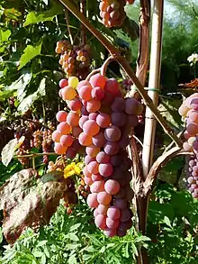 Canadice is a cultivar of seedless red grape with a bit of a spicy flavor. It is a late season cultivar ripening about mid-September into October and is hardy up to -20 degrees Fahrenheit. It is used as a table grape and is described as productive with a flavor similar to Delaware grapes. Also, these grapes come in large, cylindrical and somewhat compact clusters and are medium in individual size. Negative attributes of this particular grape are that it is highly susceptible or sensitive to black rot as well as moderately susceptible or sensitive to downy mildew and Botrytis. It is also slightly susceptible or sensitive to powdery mildew. However, tests have shown that Canadice grapes will maintain a high quality for up to four months in storage with high post-harvest sulfur dioxide fumigation.[1]