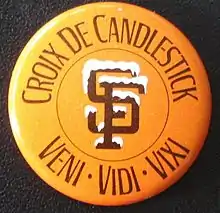 The Croix de Candlestick is an award pin that was given out to baseball fans as they exited Candlestick Park at the conclusion of a night game that went extra innings.[47][48] In reference to the ballpark's legendarily cold winds, the pin carried the motto, "Veni, Vidi, Vixi" ("I came, I saw, I survived").[49]