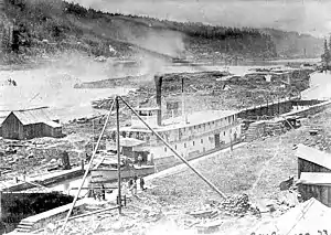 Canemah, built almost at the river's level, was wiped out by the flood of December 1861. Afterwards, the wharves and some buildings were reconstructed, and prosperity seemed certain. More steamboats were built and a portage railway was built along the east back to replace the lumbering ox carts. The People's Transportation Company was organized, and the company built an improved boat basin above the falls. A canal was cleared below the falls which lessened the portage distance. New steamboats were built above the falls to serve customers upriver. These included a second Yamhill (1860), Unio/Union (1861), a second Enterprise (1863), Reliance (1865), Active (1865), Fannie Patton (1865), Echo (1865), Albany (1868), Success, and Dayton (1868).[3][5]