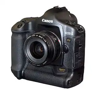 The EOS-1Ds Mark II is a digital SLR camera body introduced by Canon Inc. in 2004.[3] It was the top model in the Canon EOS line of digital cameras until April 2007, with a full-frame 16.7 megapixel CMOS sensor. The EOS-1Ds Mark II had the highest pixel count available in a 35mm format digital SLR at the time of its introduction until its successor was announced in August 2007. It uses the EF lens mount. The EOS-1Ds Mark II is a professional grade camera body and is large, ruggedly built, and dust/weather-resistant.