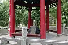 The Memorial Hall of Kumārajīva was built by monks of Japanese Nichiren Buddhism. It is 24-metre (79 ft) wide and 16.5-metre (54 ft) deep. A 120-centimetre (47 in) high wood carving statue of Kumārajīva which sitting on a lotus throne is placed in the hall. At the back of his statue is a painting of flying apsaras which was painted by Japanese painter Mise (真美子). Several steles of poems written by Zhao Puchu and other Japanese poets are inlaid on the walls.