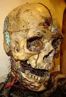 The chapel also displays two early examples of what was long thought to be a form of plastination in its basement. These "anatomical machines" (macchine anatomiche) were thought to be examples of the process of "human metallization" (metallizzazione umana) as implemented by anatomist Giuseppe Salerno ca. 1760 from a commission by Raimondo di Sangro. The exhibit consists of a mature male and a pregnant woman. Their skeletons are encased in the hardened arteries and veins which are colored red and blue respectively. Previously, historians have surmised that the corpses could have been created by injecting the hardening substances directly into the veins of living subjects.[3] However, recent analysis shows no evidence of techniques involving injection. Analysis of the "blood vessels" indicate they are constructed of beeswax, iron wire, and silk.[4]