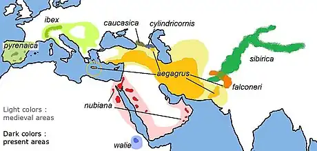 Almost all wild goat species are allopatric (geographically separated)—the only geographical overlaps are the wild goat (Capra aegagrus) with the East Caucasian tur (Capra cylindricornis), and the markhor (Capra falconeri) with the Asian ibex (Capra sibirica). In both cases, the overlapping species do not usually interbreed in the wild, but in captivity, all Capra species can interbreed, producing fertile offspring.[9]