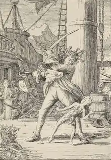 In A. C. Crispin's 2011 novel Pirates of the Caribbean: The Price of Freedom, Captain Hook appears in a conversation between Captain Teague and Pirate Lord Don Rafael: "You'll never guess who I encountered at Oporto a few months ago. [...] James. [...] He's lost a hand. [...]he said it wasn't so bad, the hook was as good as a dagger in a fight. [...] He didn't look a day older, not a day. [...] James was a lot more...subdued. [...] The taberna keeper's little lad came round to collect our plates, and when he turned and saw he, for just a second he looked—scared. No, worse than that. Terrified. [...] Can you imagine that? Afraid! Of a young boy!"[32] One of the early concept arts for Pirates of the Caribbean: At World's End showed a pirate similar to Captain Hook as one of the Pirate Lords of the Fourth Brethren Court.