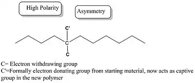 Free-radical polymerization, where radicals are the chain carriers in the propagation of the process, accounted for 40 billion of the 110 billion pounds of polymers produced in the United States in 2001.[13] Captodative olefins have a specific advantage of being responsive to solvent effects without the effect of destabilizing the radical.[4] They have also shown to undergo their radical transformation spontaneously which allows them to be useful in polymerization mechanism elucidation and better understood through NMR Studies. Furthermore, captodative ethanes are initiators with unique properties giving higher molecular weight distribution and forming block copolymers through the known radical mechanisms. The polymers obtained from captodatively substituted starting materials exhibit "desirable" properties such as optical activity, differences in polarity, solvent affinity, thermal and mechanical stabilities.
