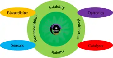 The nontoxicity and biocompatibility of CQDs enable them with broad applications in biomedicine as drug carriers, fluorescent tracers as well as controlling drug release.[52][53][54][29] This is exemplified by the use of CQDs as photosensitizers in photodynamic therapy to destroy cancer cells.[55]