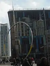 As part of the St Davids 2 development, the Hayes was pedestrianised and repaved. A new public square was created at its southern end with a large, interactive public artwork as its centrepiece called Alliance, a 25 metres (82 ft) high sculpture consisting of a large stainless steel and enamelled metal ring and an arrow column, which was initially meant to feature lights that would rise and fall with the tide.