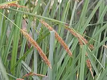 Carex spissa is a species of sedge known by the common name San Diego sedge. It is native to the southwestern United States in California, Arizona,[2] and New Mexico,[3] and far northern Mexico. It grows in wet places such as seeps and streambanks, sometimes on serpentine soils.[3] This sedge looks somewhat like a cattail.[4] It produces angled stems easily exceeding a meter in height surrounded by leathery green to reddish leaves up to about 1.2 meters long. The inflorescence is up to 80 centimeters long, with many long reddish brown flower spikes, each holding up to 300 developing fruits.