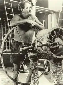 ![]() Carl Atkinson with the wheel from USS Peary, sunk in Darwin Harbour | |