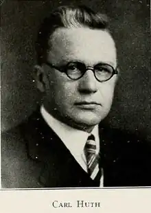 Huth, known professionally as Carl F. Huth, Jr., was born in Milwaukee to Carl F. W. Huth and Ida Hilgendorf Huth. His father taught Greek and Latin at Concordia College from 1881 to 1926.[1] Huth first attended Concordia College and transferred to the University of Wisconsin–Madison as a senior,[2] from which he received an A.B. (1904) and A.M. (1905). The topic of his bachelor's thesis was "Otto von Freising, his citation and classical knowledge."[3] Upon graduation in 1904, he received honors as a scholar in European history.[4] When he received his master's degree, the thesis requirement was satisfied by his baccalaureate thesis of 1904, so he was not required to prepare a second one.[5] In 1907–08, Huth was a Schiff Fellow in Political Science at Columbia University.[6] At Columbia, he was listed as studying both history and jurisprudence.[7]