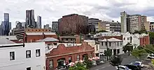 Apartments (83.2%) are the most common form of housing.[10] Carlton's apartments are low incomes, including crisis and student accommodation, with Housing Commission of Victoria towers and modern student apartment buildings. The two main housing commission estates are between Lygon and Rathdowne Streets, and between Nicholson and Canning Streets. These are configured as a mixture of 4 and 5-storey walk-up flats and 22-storey high-rise towers which are in the process of being redeveloped as mixed-tenure housing. 76.8% of Carlton's housing is rented,[10] the vast majority of which is concentrated in these apartment towers. The development of new apartment buildings to accommodate international student market since the late 1990s has transformed the once low-rise skyline of Swanston Street, so that its predominant height is about 10–11 storeys. Some strata-titled apartments are clustered fronting suburb's parks and gardens.