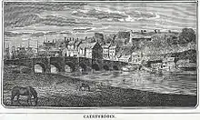 Carmarthen (/kɑːrˈmɑːrðən/, RP: /kəˈmɑːðən/; Welsh: Caerfyrddin [kairˈvərðɪn], "Merlin's fort" or "Sea-town fort") is the county town of Carmarthenshire and a community in Wales, lying on the River Towy 8 miles (13 km) north of its estuary in Carmarthen Bay.[2][3] The population was 14,185 in 2011, down from 15,854 in 2001,[4] but gauged at 16,285 in 2019.[5] It has a claim to be the oldest town in Wales – Old Carmarthen and New Carmarthen became one borough in 1546.[6] It was the most populous borough in Wales in the 16th–18th centuries, described by William Camden as "chief citie of the country". Growth stagnated by the mid-19th century as new settlements developed in the South Wales Coalfield.[6]