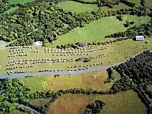 This fan-like layout recurs a little further along to the east in the Kermario (House of the Dead)[12] alignment. It consists of 1029 stones[13] in ten columns, about 1,300 m (4,300 ft) in length. A stone circle to the east end, where the stones are shorter, was revealed by aerial photography.[14]