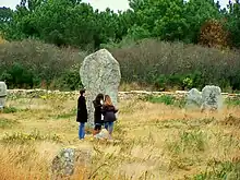 The Carnac stones (Breton: Steudadoù Karnag) are an exceptionally dense collection of megalithic sites near the south coast of Brittany in northwestern France, consisting of stone alignments (rows), dolmens (stone tombs), tumuli (burial mounds) and single menhirs (standing stones). More than 3,000 prehistoric standing stones were hewn from local granite and erected by the pre-Celtic people of Brittany and form the largest such collection in the world.[1] Most of the stones are within the Breton municipality of Carnac, but some to the east are within neighboring La Trinité-sur-Mer. The stones were erected at some stage during the Neolithic period, probably around 3300 BC, but some may date to as early as 4500 BC.[2]