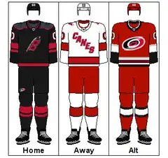 The Carolina Hurricanes currently wear black uniforms at home and white uniforms on the road. While black is one of the team's core colors, until 2022, the Hurricanes kept its usage at a minimum, opting for red helmets and red pants while using black exclusively as a trim color along with silver. Nevertheless, the Hurricanes have worn black alternate uniforms for select games since 2007.